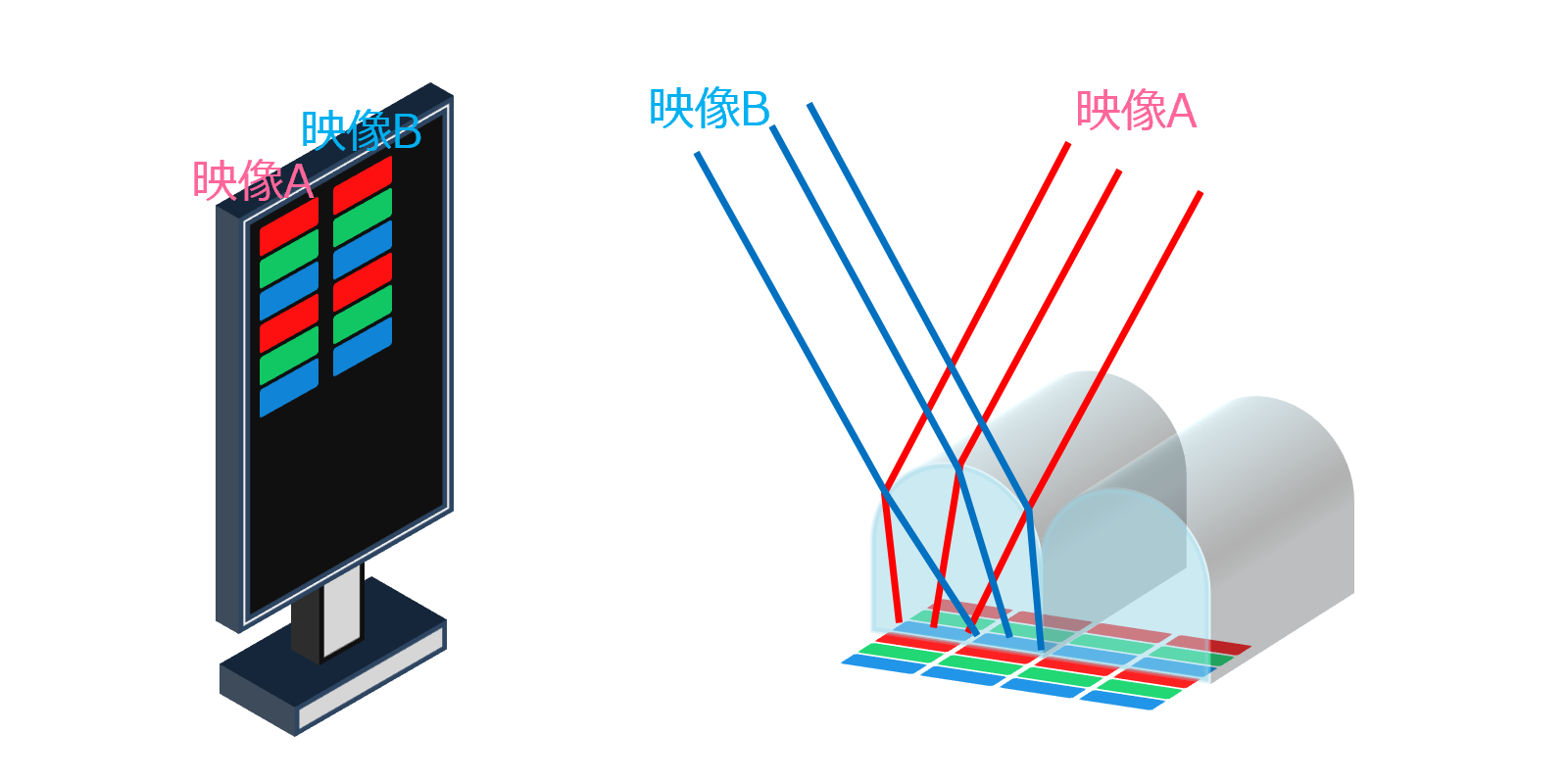 観察位置に対して、映像A、映像B、映像A、映像Bのように交互に切り替わります。