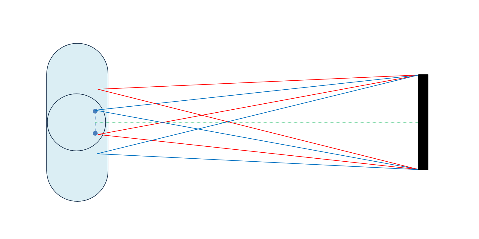 立体視では、2つの映像の結像位置を目の間隔(約65mm)の距離を離した位置になるように設計しています。