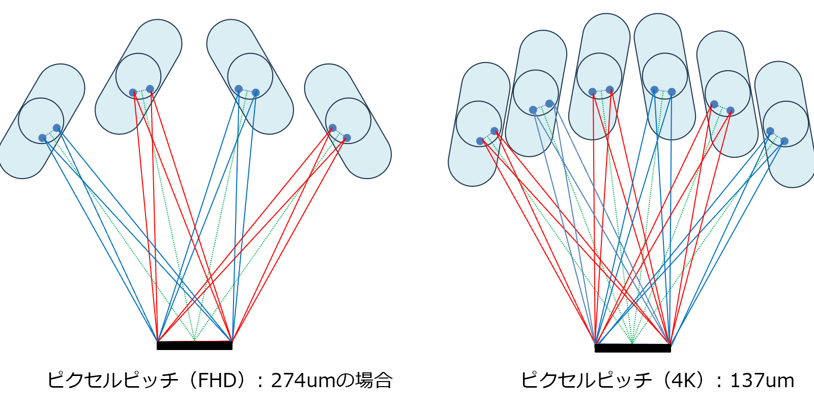 ピクセルピッチが細かくなるにつれて、映像の分岐角度は小さくなります。