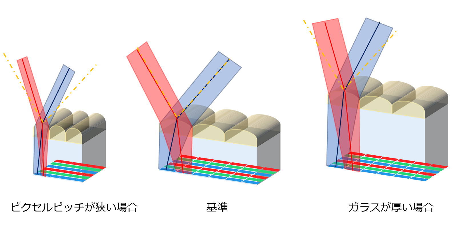 高解像度(ピクセルピッチが細かい)場合や、液晶ガラスが厚い(タッチパネル付きなど)場合は屈折角が小さくなり、映像の分岐角度が小さくなります。