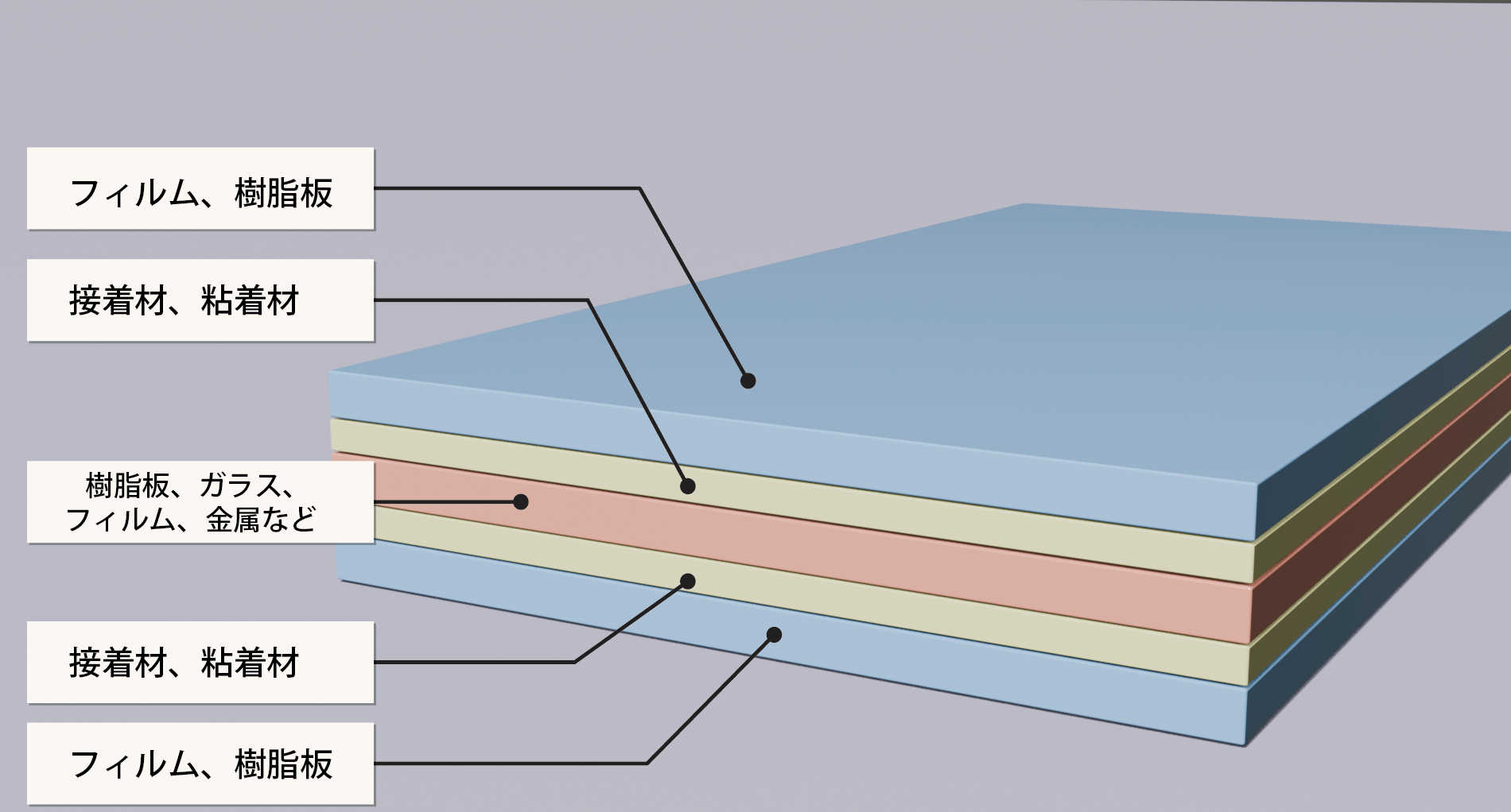 各種ディスプレイ製品の前面板などに使用されているいろいろな機能持った素材の貼り合わせが可能です。